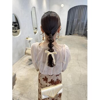 こんにちは!グラッドスタイリストの入江志穂です。今回は、結婚式にぴったりの「ぽこぽこ編みおろしヘア」をご紹介します!リボンとの組み合わせがとっても可愛いですよ♪お気軽にご相談くださいね。