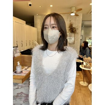 顔まわりにしっかり入れたレイヤーが、自然に輪郭を包み込んで小顔に見せてくれます。やわらかい質感で大人ナチュラルな印象に!全体は重すぎず軽すぎないミディアムレングスで、抜け感と上品さを両立しています。毛先を軽く外ハネさせるだけで、朝のセットも楽ちんですよ。