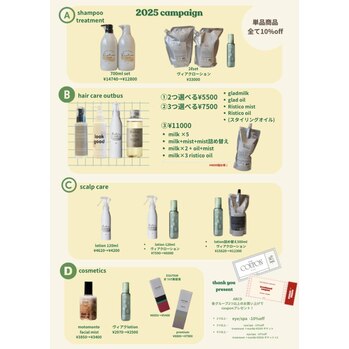 毎年恒例のアイテムキャンペーンが始まります!人気のシャンプー類やオイル、モトモントミスト、ヴィアクローション、まつ毛美容液、さらにリファ商品もキャンペーン価格でご予約いただけます。この機会をお見逃しなく!