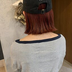 こんにちは、吉田です!今回は、トレンドの「切りっぱなしボブ」と「帽子」の組み合わせについてご紹介します。髪のカラーは鮮やかなレッドカラーで、思わず目を引くおしゃれスタイルです!
